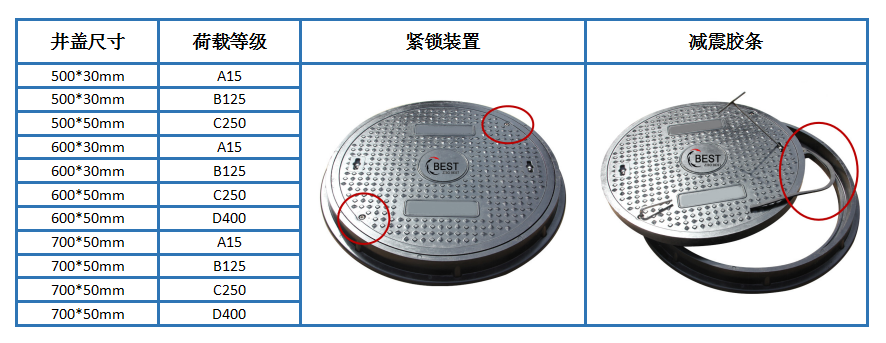 拜斯特smc井蓋的設計特點:有降噪膠條,降低過車時刺耳的噪音,例如居民小區、學校、醫院等地會格外重視;有緊鎖裝置,保障了蓋座之間的穩固性,不會因為外界的壓力造成蓋座分離發生危險事故。最重要的是材質沒有回收利用價值,項目商無需擔心井蓋被盜,行人也不用擔心會有井蓋黑洞,大大提高了樹脂井蓋的安全系數。再就是耐腐蝕、防靜電、抗老化、耐壓強、韌性好、耐高低溫等特點,使得井蓋可以在危險區域、化工區域、特殊區域一樣可以正常使用;它的可設計性也是很強的,無論是顏色字樣圖片花紋規格都可以定制,多方面的滿足了客戶的需求。